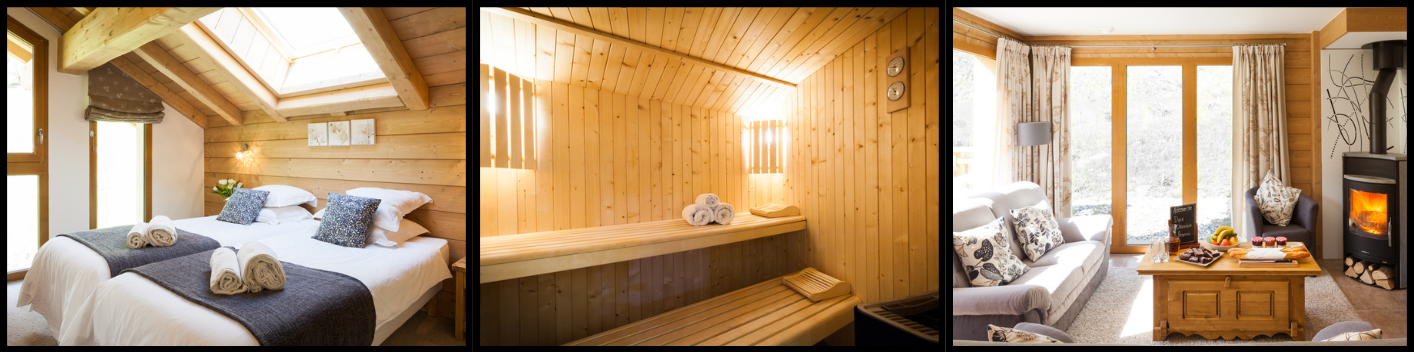 chalets have hot tubs, ensuite bedrooms, spacious lounges, roaring log fires, sundecks.